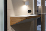 Ein Bewegungssensor aktiviert Licht und Ventilation beim Betreten, während die Luft kontinuierlich und spürbar frisch gehalten wird. Nach Verlassen der Kabine läuft die Lüftung automatisch nach, sodass die gesamte Luft im Inneren vollständig erneuert wird. In Kombination mit dimmbarer LED-Beleuchtung entsteht ein angenehmes, konzentriertes Arbeitsumfeld.