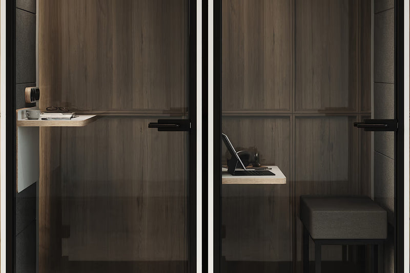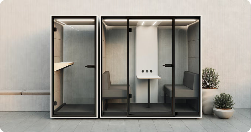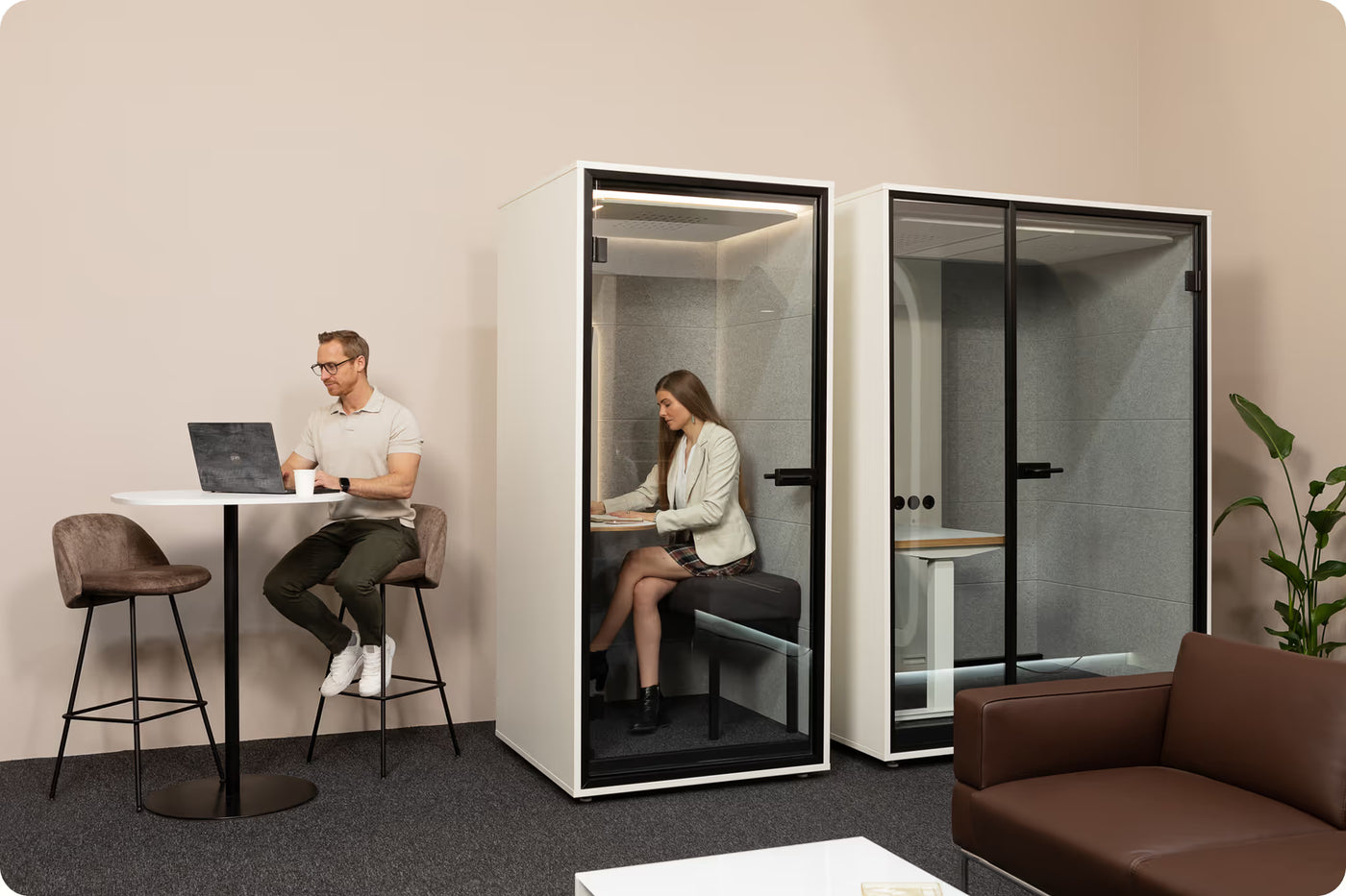 Die hochwertige Akustikverkleidung sorgt für maximale Schallisolation, während Materialien und Farben individuell wählbar sind. So fügt sich jede Box harmonisch in das bestehende Raumdesign ein – vom offenen Büro bis zur Design-Lounge.