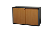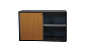 Der anthrazitfarbene Korpus wirkt elegant und zeitlos, während die Schiebetüren in warmer Eiche einen freundlichen, natürlichen Akzent setzen. Die leichtgängigen Schiebetüren benötigen keinen zusätzlichen Schwenkraum und ermöglichen schnellen Zugriff auf den Innenraum. Dank robuster Konstruktion und pflegeleichter Oberflächen ist der Schrank langlebig, funktional und ein stilvoller Begleiter im Büroalltag.