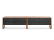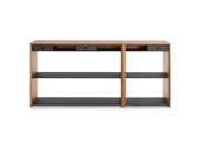 Die Konstruktion basiert auf einer stabilen, brückenartigen Konsole aus Massivholz – wahlweise Eiche hell lackiert oder amerikanischem Nussbaum. Diese „Brücke“ trägt Regalböden und Schubladenfronten, die aus dünnen Vollkernplatten gefertigt sind. Zur Auswahl stehen Oberflächen in weiß oder schwarz, letztere wahlweise mit FENIX‑Beschichtung, einem matten Nanotech-Material, das eine edle, samtige Haptik bietet.