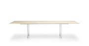Adapt ist in verschiedenen Größen, Längen und Holzarten erhältlich – darunter Asteiche, europäischer Nussbaum oder Kernbuche. Das Tischsystem lässt sich auf Wunsch mit intelligenter Medientechnik ausstatten: integrierte Kabelkanäle, klappbare Kabelwannen und Steckdoseneinheiten ermöglichen eine saubere und nutzerfreundliche Elektrifizierung.