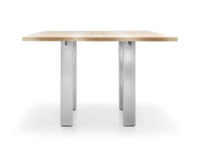 Die solide Konstruktion basiert auf massiven Längs- und Querstreben aus Bandstahl, die eine außergewöhnliche Stabilität garantieren. In Verbindung mit der hochwertigen Massivholzplatte entsteht ein Tisch, der sowohl optisch als auch funktional überzeugt.