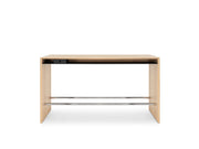 Die Tischstruktur besteht aus Wangen aus Massivholz und ist in verschiedenen Längen erhältlich. Je nach Ausführung kann sie einseitig oder beidseitig genutzt werden – mit Tischtiefen von 60 oder 80 cm. Erhältlich ist sie sowohl in Stehhöhe als auch in Sitzhöhe. Besonders praktisch: Unter der Tischplatte befindet sich ein Ablagetablar, in dem Unterlagen oder Büroaccessoires griffbereit untergebracht werden können. Eine optionale Fußreling aus verchromtem oder schwarzem Stahlrohr sorgt für Komfort beim Stehen oder Sitzen. Die La Punt Bench lässt sich elektrisch ausstatten mit Steckdosen und Kabelkanälen, sodass sie auch als aktiver Arbeitsplatz genutzt werden kann.
