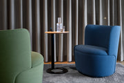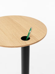Tala ist ein Tischprogramm von Girsberger, speziell abgestimmt auf Loungesessel und Sofas. Entworfen von Mathias Seiler, umfasst es einen klassischen Beistelltisch, einen Rundtisch sowie ein niedriges Modell namens Tala Low. Der Beistelltisch eignet sich ideal, um Getränke, Unterlagen oder ein Laptop griffbereit abzulegen; der Rundtisch ergänzt Räume für informelle Gespräche; Tala Low bietet zwei Ebenen als Ablagefläche in etwa 27 cm Höhe. Allen Tala‑Tischen gemeinsam ist ein rundes Behältnis, das durch das Standrohr in die Tischplatte integriert ist – praktisch für Schreibgeräte oder Accessoires. Die Gestelle sind aus schwarz beschichtetem Stahl, die Tischplatten sind wählbar: massiv Eiche, amerikanischer Nussbaum oder Vollkernplatten, wahlweise in Weiß oder Schwarz.