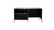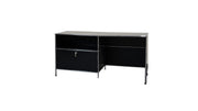 Der schwarze Korpus wirkt modern und edel, während die präzise verarbeiteten Oberflächen und das stabile Gestell aus hochwertigen Materialien für Langlebigkeit und Robustheit sorgen. Die Kombination aus offenen Fächern und einem abschließbaren Element ermöglicht flexible Nutzungsmöglichkeiten und sorgt für eine klare, organisierte Optik. Dieses Sideboard ist die perfekte Lösung für stilbewusste Arbeits- oder Wohnumgebungen, die Funktionalität und Design gleichermaßen schätzen.