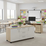 Das E10‑Sideboard von Nowy Styl ist als flexibles und funktionales Büromöbel konzipiert. Es bietet eine Kombination aus großzügigem Stauraum hinter zwei Flügeltüren und mehreren Schubladen — ideal zur übersichtlichen Aufbewahrung von Akten, Unterlagen und Büromaterialien. Die Konstruktion erfolgt aus melaminharzbeschichteten Spanplatten der Güteklasse E1, wobei Oberboden, Korpus und Front robust gefertigt sind und die Rückwand stabil und standfest bleibt. Die Türen lassen sich weit öffnen, was den Zugriff auf Inhalte erleichtert. Das Sideboard wird fertig montiert geliefert und ist mit einem Schloss ausgestattet, was eine sichere Aufbewahrung sensibler Dokumente ermöglicht.